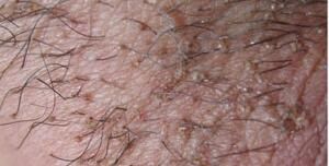有时被咬处见黄豆大或指甲大青斑,即刚灰色色素性小斑点,一般不超过1cm直径,这种斑点可能是皮肤对阴虱涎液的过敏反应,也有人认为是由于阴虱吸血时,唾液进入血液而使血红蛋白变色,虱咬处微量出血,该处变为青斑。杀灭阴虱后,青斑可继续存在数日。在毛囊口可找到阴虱,毛干处可找到铁锈色虱卵。