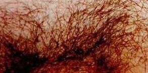 阴虱病患者被阴虱叮咬处一般是呈现局部发红,有小红斑点,其上有血痂,局部产生过敏反应,常隆起出现丘疹。