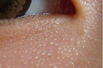 汗管瘤初起皮肤侵害为针头至豌豆大的半球形丘疹,大多呈正常肤色,少部分呈淡褐色或褐黄色,皮疹常密集散布,多互不融合,个别的有趋向融合的现象,表面常伴蜡样光泽,质地中等,少者皮疹几十个,多者可达百个以上。丘疹多为单个散在散布,有时可密集成片,但相邻的两个突出不产生融合、突出触之稍有硬实感,少部分质地较软。