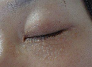 2、汗管瘤典型皮损:汗管瘤刚开始发病,针头至豌豆大的半球形丘疹,几个到几十个数目不等,边界清楚,表面光滑或附有油腻物,多互不融合,个别的有趋向融合的现象,为皮肤色,淡黄色或褐黄色。