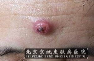 临床表现:角化棘皮瘤好发于老年人,尤其好发于面部的突出部位,手背、肩背部、和胸部也偶有发生,初始皮损为米粒大小的半球形凸起的肿瘤,表面光滑与皮肤颜色相似,生长迅速,可在1-2月内迅速增大达到直径为2cm左右的肿瘤。