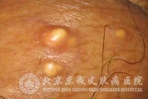 3.脂肪瘤:是一种位于皮下的扁平分叶状的良性皮肤肿瘤,当用手指捏住肿物两侧挤压时可发现橘皮现象。