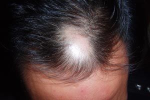 2、假性斑秃:患者在发病后,头皮的皮损处出现萎缩的症状,皮损部位显得光滑而富有光泽,仔细观察,发现看不清朝毛囊的开口,而皮损斑片的边缘周围处,没有明显无上粗下细的毛发。