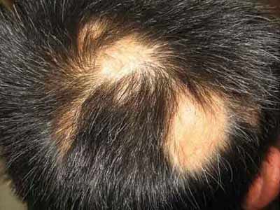 2、头发突然脱落,呈现单个或多个圆型光秃处,原因不明,但多认为是自体*机制与情绪压力有关,愈后良好,只有很少数会发展成全秃。