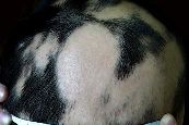进展期时毛发不断脱落,脱发斑渐扩大,边缘处毛发松动,易拔下。