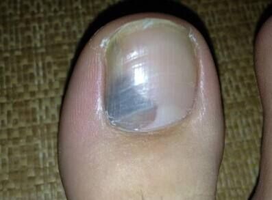 4、真菌和增生的角质物在甲板下大量堆积,使甲板的远端明显高出而呈翘起状,此时病甲变肥厚,更混浊,变色也更明显。趾甲甲板翘起影响穿鞋,严重影响生活质量。
