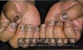 7、慢性甲沟炎型灰指甲:表示为外侧甲皱襞及近端甲皱、表皮护膜变质或变棕色。较重要的特点是有甲沟炎存在,甲周皱襞肿胀而没有甲下角化太过,可有少量渗液但从不出脓。此型亦多由念珠菌引起。