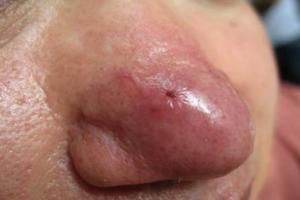 早期鼻部出现红色的小丘疹、丘疱疹和脓疱,鼻部毛细血管充血严重,肉眼可见明显树枝状的毛细血管分支,较终鼻子上出现大小不等的结节和凹凸不平的增生,鼻子肥大不适,严重影响患者的美观。病程缓慢,无明显的自觉症状。