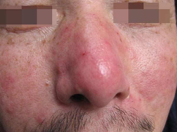 酒糟鼻发病的时候,鼻子潮红、油腻发亮,还会有持续性的瘙痒感。前期的时候会有红疹出现,毛细血管会不断的扩大,假如不积的治疗,病况不断的恶化,还会出现结节和增生,给患者带来许多的痛苦,患者要尽早的承受治疗。