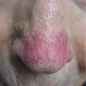晚期为鼻赘期:鼻部皮肤腺及结缔组织增生,使鼻尖、鼻翼肥大,呈结节状隆起,表面高低不平,毛囊口及毛细血管扩张更加明显,病程慢性,难以消退。