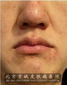 2、侵犯部位主要是“口罩区”,即口周、颏部及鼻侧;为对称分布于口周的丘疹、丘疱疹、脓疱、红斑及鳞屑。