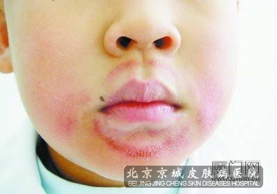 2、环绕口唇周围红斑,伴小丘疹、脓疱或脱屑。