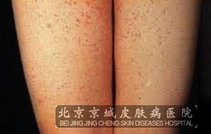 二、过敏性紫癜性苔藓样皮炎:常出现于中老年人,男性多于女性。皮损为细小铁锈色苔藓样丘疹,常常伴有紫癜样受损,呈紫红色,可融合呈境界不清的斑点,常伴有不同程度的痒痛。