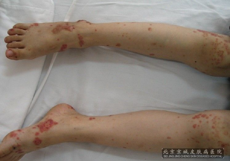 单纯性紫癜:常突然发病,主要发生于下肢皮肤,尤其是双小腿伸侧。皮疹呈对称性分布,高出皮面,表现为针头至黄豆大的淤点、淤斑,压之不褪色,由于反复发作,病程可达数月至数年之久。本型一般无全身不适。