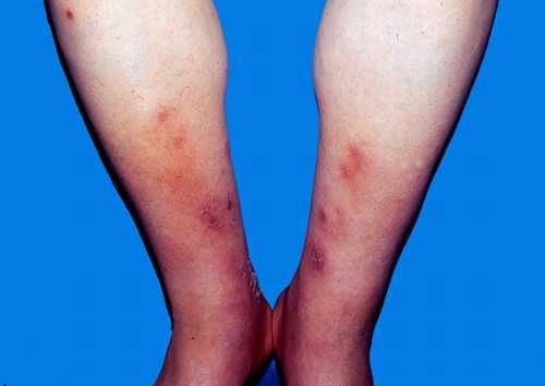 常见于小腿伸侧的红色或紫红色疼痛性炎性结节,青年女性多见,病程有局限性,易于复发。发病前有感染史或服药史,皮损突然发生,为双侧对称的皮下结节,自蚕豆至核桃大不等,数目达10个或更多,自觉疼痛或压痛,中等硬度。早期皮色淡红,表面光滑,轻微隆起,几天后,皮色转暗红或青红,表面变平。3~4周后结节逐渐消退,留暂时色素沉着,结节始终不发生溃疡。皮损好发于胫前,也可见于大腿、上臂伸侧及颈部,少见于面部。慢性结节性红斑不同于急性结节性红斑的特征,其常发生在老年妇女,皮损为单侧,若为双侧,则不对称,除关节痛外,不伴有其他全身症状。结节不痛,且比急性结节性红斑软。
