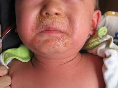 1. 非大疱性脓疱疮:占脓疱疮的70 ,较常见于儿童。可以是原发的,即细菌直接入侵正常皮肤,或继发于其他破坏了皮肤屏障的皮肤病变,如湿疹。早期表现为红斑,很快进展为一过性小水疱和脓疱,之后表浅糜烂,上覆典型蜂蜜色黄痂,从感染部位迅速扩展至周围皮肤。较终愈合,不留瘢痕。好发于口鼻周围和肢端。5 是由A组β型溶血性链球菌(血清型1、4、12、25和49)引起,可导致急性链球菌感染后肾小球肾炎。