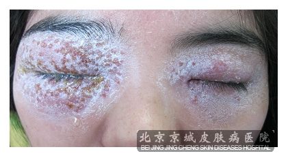 本病基础皮肤病大多是异位性皮炎,偶尔可发生于脂溢性皮炎、脓疱疮、疥疮等。多见于三岁以内的儿童,也可发生于成人。感染单纯疱疹病毒后,约经5—9天的潜伏期,可出现高热、全身不适、嗜睡等症状。第二天就开始发疹,突然发生多数较密集的水泡,迅速变为脓疱,也可先发生小红色丘疹,而后很快变为水泡、脓疱。基地明显红肿,部分疱顶有脐窝状凹陷。2-3天后损害可相互融合成片,但其附近仍然有散在性典型皮疹。经8-14天到机体产生足够抗体,皮疹渐渐干燥结痂,留有色素沉着及浅表瘢痕而愈,全身症状也逐渐减轻而消失。合并症可有结膜炎、角膜炎或角膜溃疡、脑炎、中耳炎、肺炎、便血、尿闭等。