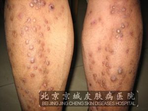 4.其损害初期为针帽至米粒大的丘疹,可逐渐增大成为绿豆至黄豆大、半球形、坚实隆起皮肤表面的丘疹与结节,一般呈褐色或灰褐色。继之可因搔抓过度而使结节表面变的粗糙,皮质增厚或呈疣状,还可能发生苔藓样变。也可引起出血和结痂等,结节表面常可见到剥蚀,而且手足背数目多少不等,彼此孤立不相融合。
