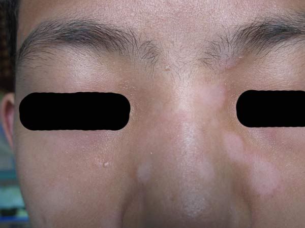 4、 白癜风初期表现白斑多为浅白色,慢慢发展为云白色、纯白色、瓷白色。同一部位的白斑颜色也可能出现不同,有的自内而外表现为白、灰白、近正常肤色三种颜色。