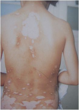 (2)对久治无效的白斑,既不能明确是基本型白斑,患者又迫切希望治疗时,可做组织病理检查,以判断是否存在黑素*,特别是对二羟苯丙氨酸(多巴)反应阳性的黑素*,以做 估计的参考。