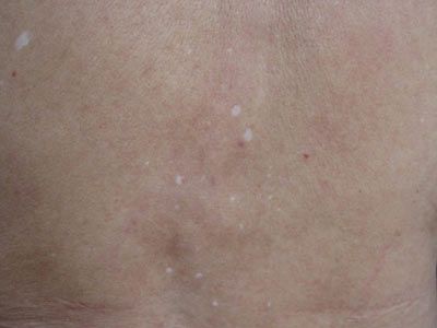 2.躯干、四肢非暴露部位白色斑疹,2~5mm大小,圆形,境界清楚,表面稍凹陷。
