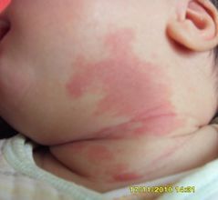 鲜红斑痣又称葡萄酒样痣或毛细血管扩张痣,在出生出现,好发于面、颈部,大多为单侧性,偶为双侧性,有时累及粘膜。损害初起为大小不一或数个淡红、暗红或紫红色斑片,呈不规则形,边界清楚,不高出皮面,可见毛细血管扩张,压之部分或基本退色,表面平滑。