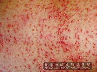 1、此型在临床上很常见,主要症状表现为红色的丘疹或斑疹,疹子顶部还有针帽大小的水疱,皮损相互融合,摩擦溃破后,易感染。