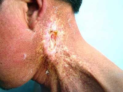 应保持患者放射区皮肤的清洁与干燥,避免局部刺激,如避免用手挠痒,禁用肥皂水清洁,避免涂擦药物等,同时应避免风吹及日晒。嘱咐患者照射部位勿与粗糙物接触,应穿无领柔软上衣。
