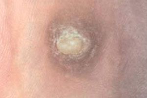 软性鸡眼则好发于趾间摩擦处,特殊在第四及第五趾之间,症状为疼痛、发炎、鸡眼为白色且软的角质化。临床上必需与疣作辨别诊察。