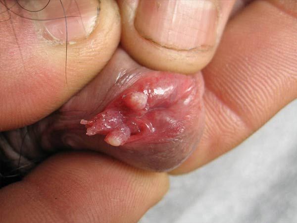 3、 病初为淡红或污红色粟状大小赘生物,形态如丘疹状、乳头状、菜花状、鸡冠状,性质细嫩、较先进稍尖,减少痛苦痒感,渐渐长大或增多。