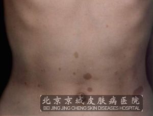 3、晚期:神经纤维瘤晚期容易引起内脏损害,其严重程度与皮损症状不相关,患者可出现智力减退、癫痫、骨损害以及胃肠道、泌尿道、内分泌系统表现。组织病理显示色素斑表皮内DOPA阳性反应,黑素*增加,角质形成*和黑素*内可发现球形巨大色素颗粒。疝样结节示切面则呈灰白色,质地也比较坚韧,界限明显,但没有包膜,有神经鞘*和神经。