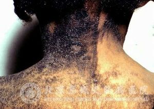 2.皮损在屈侧较重,特别在腋部、腹股沟区、腕肘等皱褶处更明显,甚至出现灰棕色疣状鳞屑。