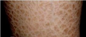 鱼鳞病的典型临床表现是淡褐色至深褐色菱形或多角形鳞屑,鳞屑中央固着,边缘游离,状如鱼鳞。皮损对称分布,以四肢伸侧及躯干为主,尤以小腿伸侧较为好。四肢伸侧的皱褶部位如肘窝、腋下则不累及。皮损随年龄增长而逐渐加重,青春期后皮脂腺活跃,症状减轻。在后背、上臂及股伸侧可见针尖大小与毛囊一致的角化性丘疹,在冬季掌跖常见线状皲裂和掌纹加深。通常无自觉症状。