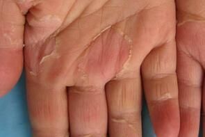 掌跖角化病一般都是从婴儿期开始发病,表现为掌跖部位的皮肤出现粗糙症状,病情严重的时候还可导致掌跖出现弥漫性斑块,皮损的边缘角质增厚,表现光滑,色黄酷似胼胝或呈疣状增厚,也可能会因为弹性消失而出现皲裂症状,患者的主观症状是有明显的疼痛感,甚至还可出现手足活动障碍。掌跖角化病的损害一般局限在掌跖部,也可见于手背、足背、指、趾、肘、膝、前臂的伸侧、胫前和踝部等部位,多对称分布。患者也可伴有多汗、甲板增厚、混浊等症状。还有部分患者合并有先天性鱼鳞病或其他先天性异常。
