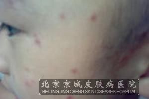 3、典型皮损为绿豆大小的红色丘疹,性质坚硬,搔破后结痂,经搔抓之后呈现风团,风团消退之后可恢复原形。