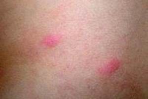 ②起初仅为小的风团,经过多个小时之后,发展为椭圆形红色丘疹,大概类似花生米大小。丘疹的中央时常会出现小疱,皮疹多成批产生,一般一周内消退。