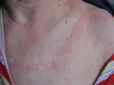 (2)发疹期。在前驱期后开始发疹,首先出现在于耳后、发际、面部,而后迅速蔓延到颈部、上肢、躯干及下肢,2~5天内泛发全身。皮疹为一种玫瑰色斑丘疹,压之褪色,疹间皮肤正常,疹多时可相互融合。经过前驱期之后便会迅速出现风团,并且还伴随着剧烈的瘙痒症状。