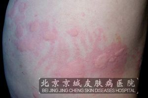急性荨麻疹(acute urticaria)在所有荨麻疹中约占1/3。起病较急,皮损常突然发生,为限局性红色大小不等的风团,皮损大多持续半小时至数小时自然消退,自觉剧烈瘙痒、灼热感。部位不定,可泛发全身或局限于某部。常是急性发作,全身瘙痒风团皮疹,可伴高烧,严重者血压下降甚至休克,病程1~2周内自然应积治疗。