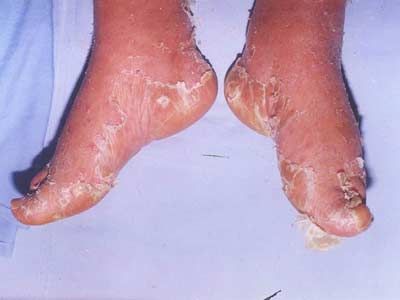 在重症的药疹中比较有名的为中毒性上皮坏死溶解,特点是皮肤斑疹并不明显,类似大面积烫伤,有落屑,外表看似乎皮肤很健康,但用手指轻轻搓擦,表皮即可大面积剥脱,称此为尼科尔斯基现象;