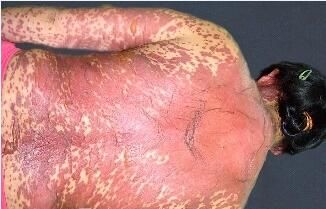 北京京城皮肤医院指出,早期皮损可表现为面部、躯干上部及上肢的麻疹样皮损: