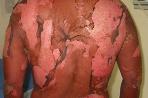 皮损起初表现为麻疹样或猩红热型损害,逐渐增重,较终全身皮肤呈现弥漫性肿胀、潮红,皱褶部位出现水疱、糜烂、渗液、结痂。灼痒感重;重者可伴发支气管肺炎,中毒性肝炎,肾炎,皮肤感染,甚至败血症。若处理不当,伴发水电解质紊乱、继发感染时也可危及生命。