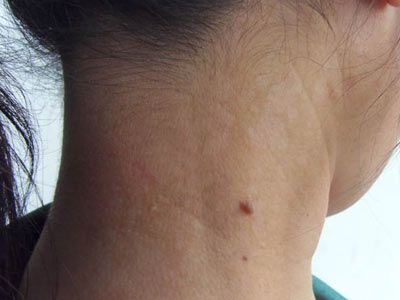 4、边缘清楚,与皮肤持平或微微高起。表面覆以薄糠秕样鳞屑,有光泽,尤其是对光侧看时,皮损表面反光性强。新皮损色深,呈灰色、黄色、棕色、淡褐色或褐色。