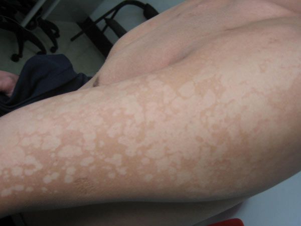 花斑癣皮损的表面往往会有少量的易剥离的糠秕样鳞屑覆着,可呈灰色、褐色或黄棕色不等,同时也可出现多种颜色的损害共存,一般可呈花斑状。花斑癣的皮损一般没有炎症反应,只有部分患者的皮损部位偶有痒感。