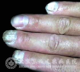 2、 白色表浅型:指趾甲较容易出现白色表浅型甲癣。其中石膏样毛癣菌或霉样菌、镰刀菌及曲菌是引起白色表浅型甲癣的主要原因。白点或白色1毫米直径大小的斑片出现在甲板表层,病甲呈脆性而刮落。