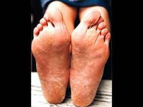 2、增厚型:多见掌跖皮肤增厚、粗糙,皮纹加深;夏季水疱脱屑,入冬则皮肤干厚,甚至有皲裂、出血和疼痛。