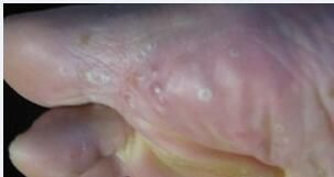 水疱型手足癣多发生在夏季,症状是趾间、足缘、足底出现米粒大小,深在性水疱,疏散或成群分布,庖壁较厚,内容清澈,不易破裂。数日后干燥脱屑,相互融合形成多房性水疱,撕去庖壁,可见蜂窝状基底及鲜红色糜烂面,剧烈瘙痒。