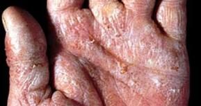 (2)鳞屑型:表现为角化过度,干燥,粗糙,脱屑,基底淡红。多单手发生,也可双手均累及。自觉瘙痒较轻,冬季常皲裂疼痛。