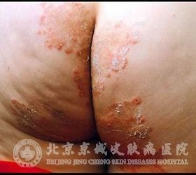 京城皮肤医院的介绍,臀部和大腿上内侧是股癣较容易病发的部位,阴茎及腹股沟皱褶部也会出现一定程度的股癣症状。一般情况下为边缘清晰、稍微隆起的红斑,渐渐扩大,上面有落屑,渐渐由红色转为褐色或肤色。股癣单侧或两侧先后发病,初起为小丘诊(小疙瘩),奇痒,随着病情的不断恶化而皮损面积不断扩大,中央平坦的圆形或多形性皮损,伴有一定程度的脱屑现象。向上或向后蔓延至会阴、肛周及臀部。病变单独发生在臀部者称臀癣。