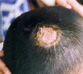 黄癣由许蓝毛癣菌引起,也初发于儿童,但到成年后不会好。黄癣初起时,在头皮上可出现针头大小的疹子,以后逐渐扩大,其上覆盖着许多大小不等的黄色厚痂,许多黄癣痂集聚在一起,可以堆得很厚,如不除去,时间一久,经过空气氧化,可成松脆的灰黄或白色厚痂。痂下可以是一个深在性的溃疡,并常继发其他细菌感染。患者的头部发散出一股特殊的臭味,瘙痒明显。黄癣呈缓慢地、进行性地发展,成年期不会自然消退,直到全部头发几乎脱光,头皮萎缩才休止。