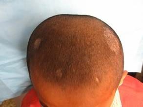 2、白癣:刚发病是白色鳞屑性局限斑片,其上头发变为灰暗,稍有痒感,随着病情发展,会发生融合,好发于头顶中间,多为儿童期起病,青春期后可自愈。